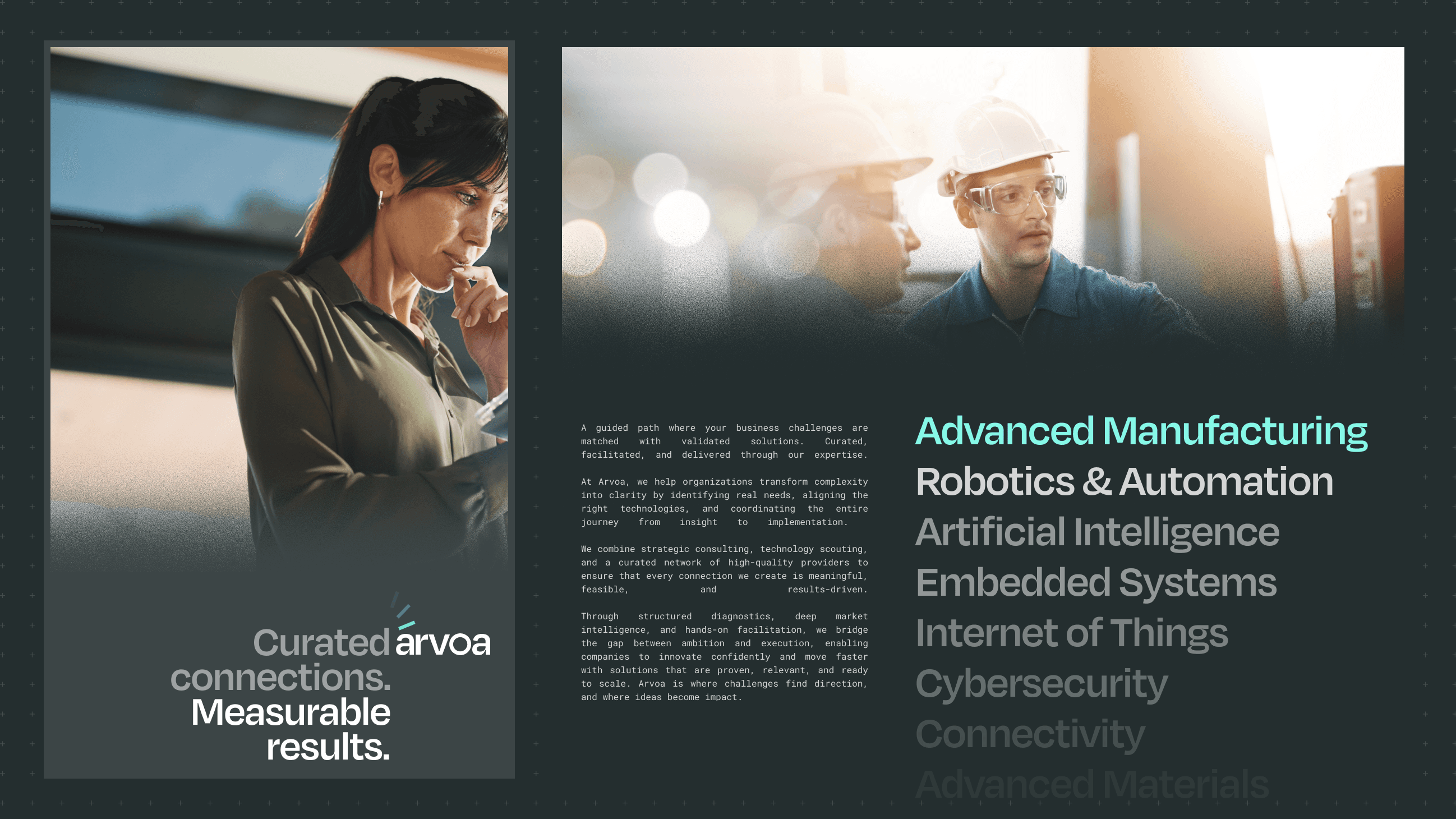 The challenge was to express Árvoa unique role: a consultancy that guides organizations through complex business challenges and intentionally matches them with validated technological solutions. The identity had to feel contemporary and digital, yet communicate the craft, focus, and curation that define how Arvoa works.
